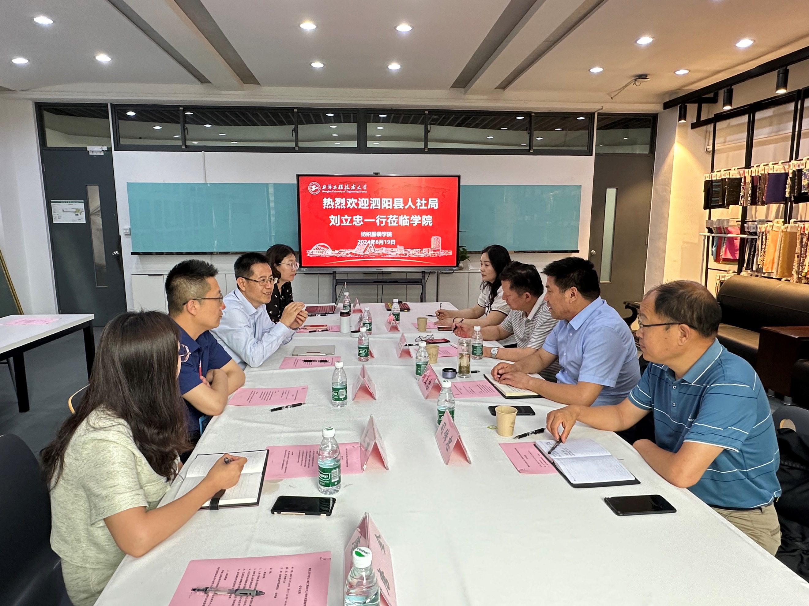 2024年6月19日下午,江苏省泗阳县人社局就业服务中心主任刘立忠、副主任刘新华、江苏苏丝丝绸股份有限公司董事长刘文成及监事长司传忠到公司开展交流和对接。双方重点围绕蚕丝在生产和织造过程中的品质问题与公司展开技术研讨。304永利集团经理辛斌杰、副经理曲洪建、副书记谢志霞、纺织工程系副主任杨群、朱婕参加了此次交流会。交流会由304永利集团副经理曲洪建主持。