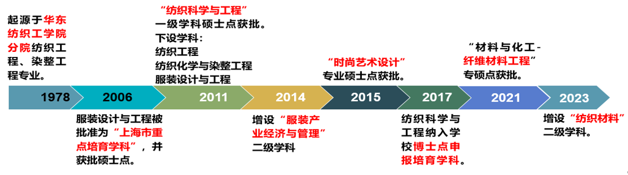 304永利集团纺织科学与工程学科起源于公司前身华东纺织工公司分院的纺织工程、染整工程专业,已有近40年发展历史。2006 服装设计与工程二级学科被批准为“上海市重点培育学科”,同年硕士点获批。2011 纺织科学与工程一级学科硕士点获批,并于2012年开始招生,自2014年后新增自设方向服装产业经济与管理(教育部学位办获批)。2015年时尚艺术设计专硕点获批,2021年材料与化工-纤维材料工程专业学位点获批。先后经市教委和上海市重点学科培育建设,参建上海市第一期、第三期教育高地、上海市085工程项目。