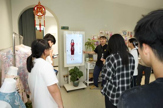 学员探访产学合作教育基地――划云集团,开展一场融合传统非遗技艺与现代科技的文化实践之旅。不仅近距离观赏了精美的旗袍作品,还亲身体验了从设计到制作的全过程。并饶有兴趣地体验虚拟试衣镜,无需实际更换衣物,即可在屏幕上瞬间“试穿”不同款式、花色的旗袍,直观感受科技如何为传统服饰行业带来便捷与革新。