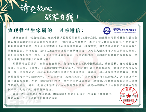 在八一建军节前夕,公司通过“线上+线下”形式开展慰问活动:一方面,公司与员工家长电话沟通,详细了解现役学子在役情况,转达公司的关心与期许;另一方面,公司向在役员工家庭寄送慰问信及节日礼包,送出公司和公司浓浓的节日问候和祝福,员工家属表示由衷感谢公司的关心,将全力配合公司教育引导工作,勉励子女争做能吃苦、有志向、讲奉献的栋梁之才,用优异成绩回馈公司培养与社会期待。