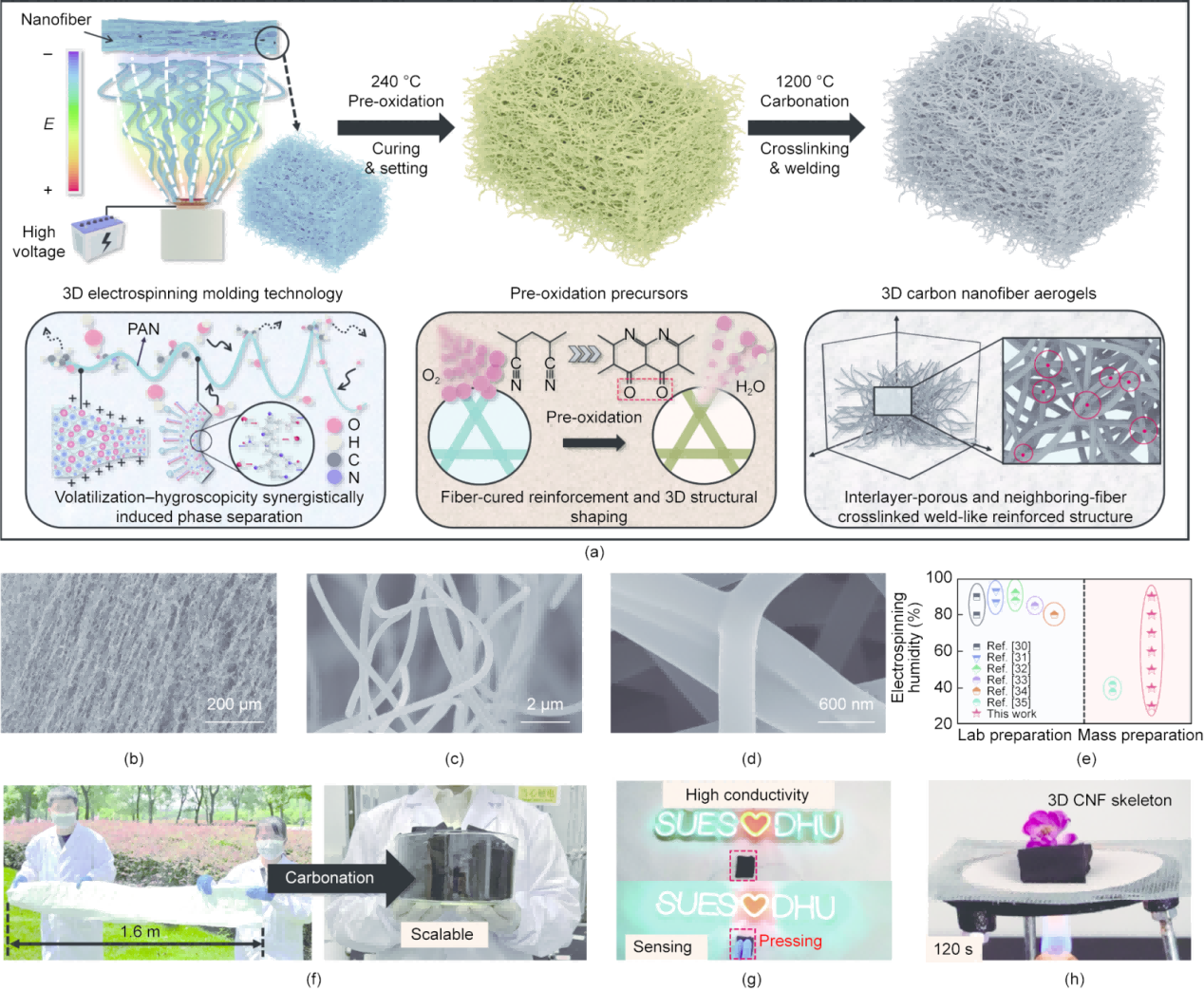 面对深空探测技术中极端环境材料“脆性大、结构易塌陷”的难题,公司团队另辟蹊径,创新提出了“挥发-吸湿协同诱导相分离”3D静电纺丝成型技术 。通过构建独特的“焊接增强结构”,成功研发出一种兼具超轻、超弹及耐极端温度特性的碳纳米纤维气凝胶(CNFAs) 。