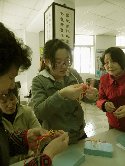 3月21号下午,服装公司科学商店成员一行5人来到对接单位——松江区岳阳街道民乐社区服务中心,与社区内的居民朋友们一同开展了“编制中国结”手工编织活动。