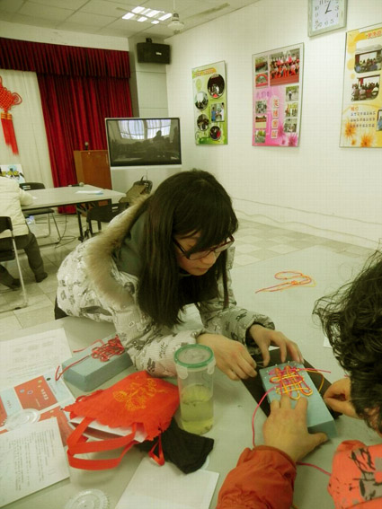 活动伊始,同学们向每位参与者发放了编织所需的材料,居民们十分好奇地看着这些零碎的绳线,迫不及待地叫大家“小讲师们”开始授课。同学们十分细心地教导大家编织的每一个步骤,也耐心地为她们一一做示范,务求让每一位居民都能够清楚地了解到编制过程。虽然编制的过程稍有复杂,但是学员们却十分认真地在讲师们的教导下用心地完成每一个步骤。当她们看到自己成功编织出中国结的时候,脸上都洋溢着欢乐的笑容,乐在其中,因为每一个中国结都是自己亲手编织的,是用心学习的成果。此时,原本站在旁边的观众也被热闹的气氛所带动,一起加入到编织中国结的队伍中来。