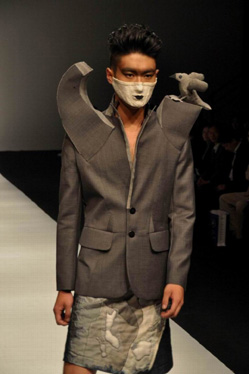 所谓大象无形,大音希声,本系时尚发布会展示的套服装列尝试从逆向思维的角度,先表现精心叠加的匠气之趣,再跳脱出无穷衍生的纷繁设计迷恋,以轻盈无痕的极简风貌结尾,是设计者涉及本系列的完整心路历程。造型的完美要求是前面大量建筑感、体量感设计的背景,而最后的设计则是物极必反的一个诉求,希望简单的设计能够有小的触动,于无声处听惊雷,算是一个设计者对时尚界的夸饰造型的自省。