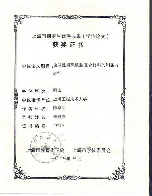 上海市研究生优秀成果(学位论文)是反映学位授予单位公司产品质量的重要标志,评选工作每年举行一次。陈卓明同学获得上海市研究生优秀论文是对公司纺织科学与工程一级硕士点的充分肯定,是与公司多年来完善公司产品质量监督和激励机制、提高公司产品和学位授予质量的诸多工作分不开的。