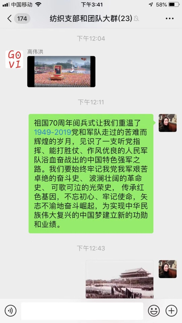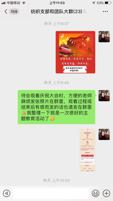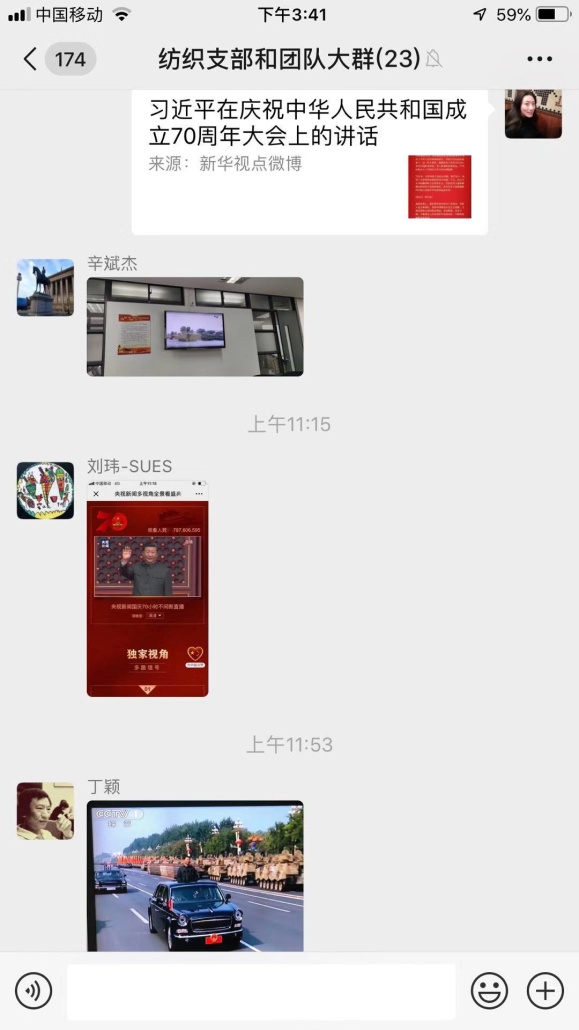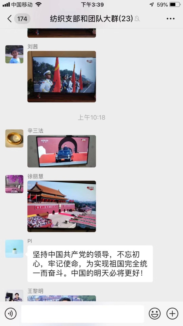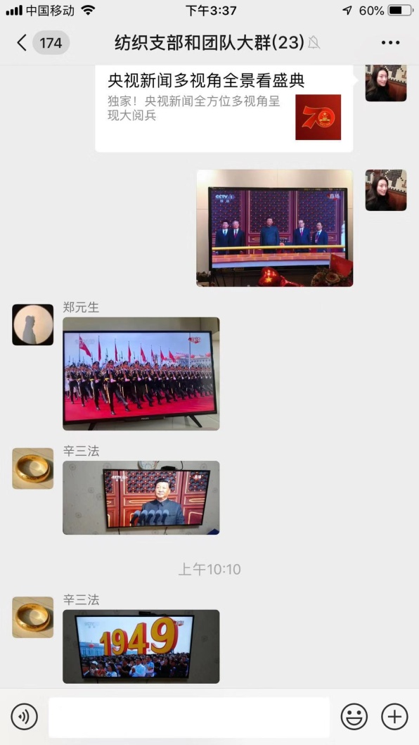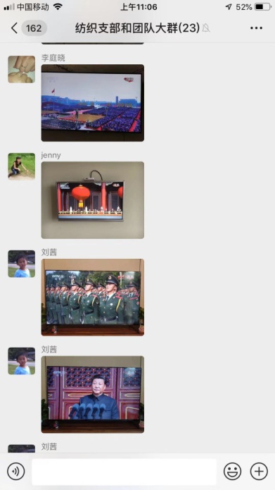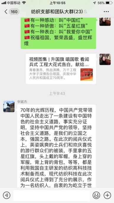 2019年10月1日上午10点,服装公司纺织工程党支部组织全体党员在家观看了庆祝祖国70周年华诞阅兵式,并在支部微信群进行了交流。