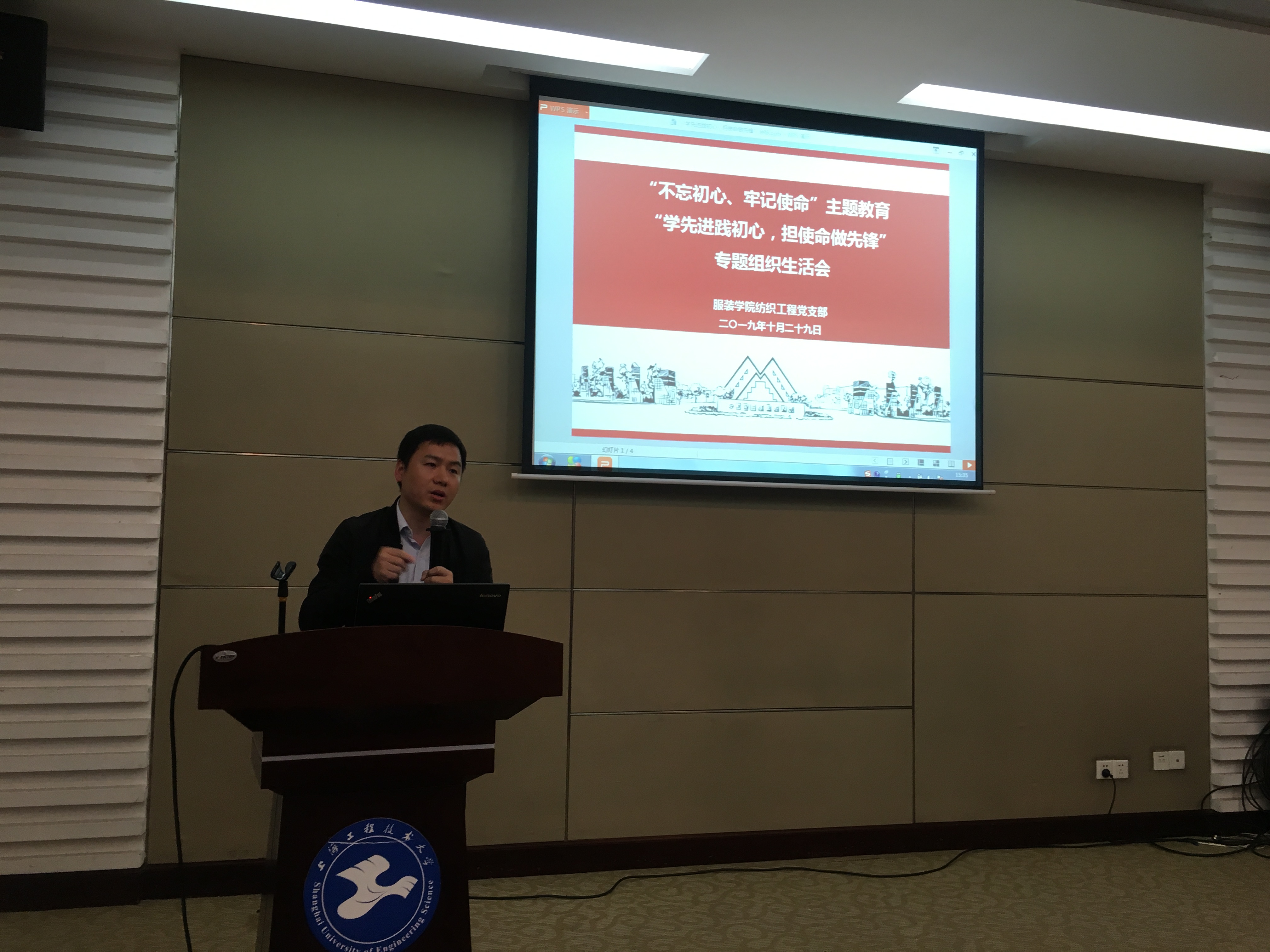 为推动"不忘初心、牢记使命"主题教育进一步往深里走、往心里走、往实里走,2019年 10月29 日 下午13:30服装公司纺织工程党支部在图文四报召开了“学先进践初心,担使命做先锋”专题组织生活会。纺织工程专业的本科生、研究生党员及入党积极分子参加了本次活动,服装公司其他党支部师生代表前来进行了观摩。市委第七巡回指导组万世东老师在校组织部顾守进老师的陪同下莅临指导。