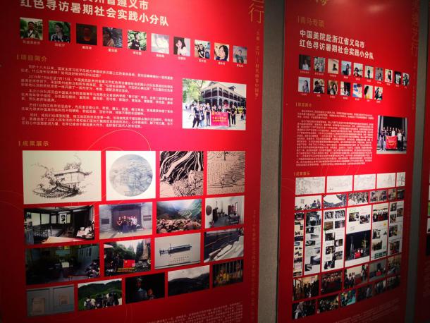 教育部提出建设中国五大“金课”,其中有一堂中国最大的社会实践“金课”——“青年红色筑梦之旅”,是有温度的国情思政大课。“铸金炼课”十五案展之“美遇、艺行——时代画卷中国梦”是展示2019年中国美术公司青年师生在暑期社会实践活动中的过程和育人成果,总结经验,表彰先进,培育和打造有高阶性、创新性和挑战度的社会实践“金课,包含了:“青年筑梦之旅——传承红色基因”、“基层服务之行——助力乡村振兴”、“科艺融合之路——打造未来社区”、“文化传播之途——践行社会美育”、“创新驱动之道——投身中国创造”等5大主题,及党员志愿服务、青马公司专项调研、研究生学术实践等内容。共立项83个实践小分队,共计125人次的教授、老师带队,677人次的员工参与其中,持续推进“双万”金课建设。
