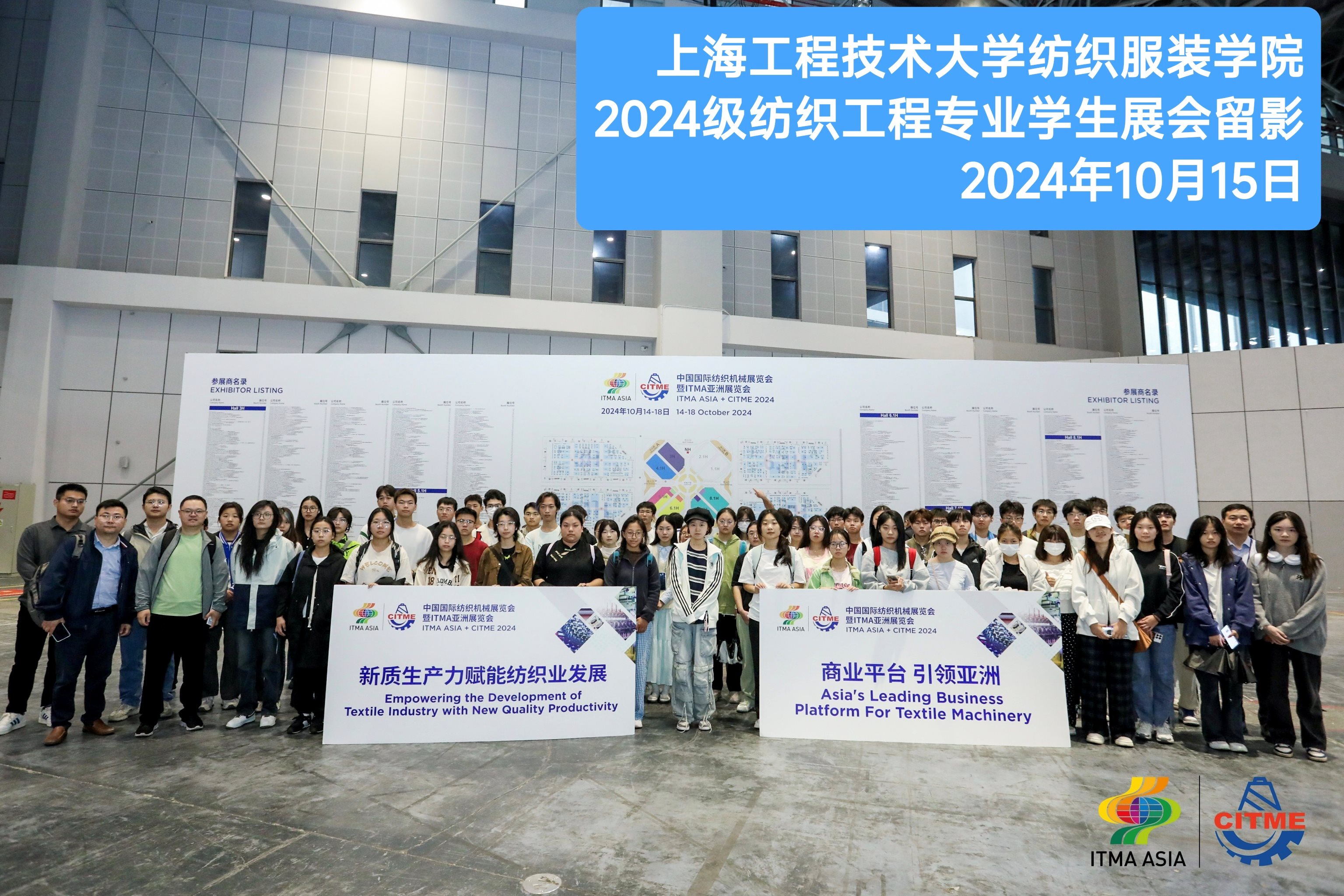 The2024 China International Textile Machinery Exhibition and ITMA AsiaExhibition were held at the National Exhibition and Convention Center(Shanghai) from October 14 to 18, 2024. On October 15, more than 60freshman students majoring in Textile Engineering from the Schoolof Textiles and Fashionvisited the exhibition led by Associate Professor Gao Weihong, thedeputy director of the Textile Engineering Department. Otherparticipating faculty members included Sun Guangwu, the director ofthe Apparel Design and Engineering Department, as well as Ou Kangkangand Zhan Zhu from the Textile Engineering Department.