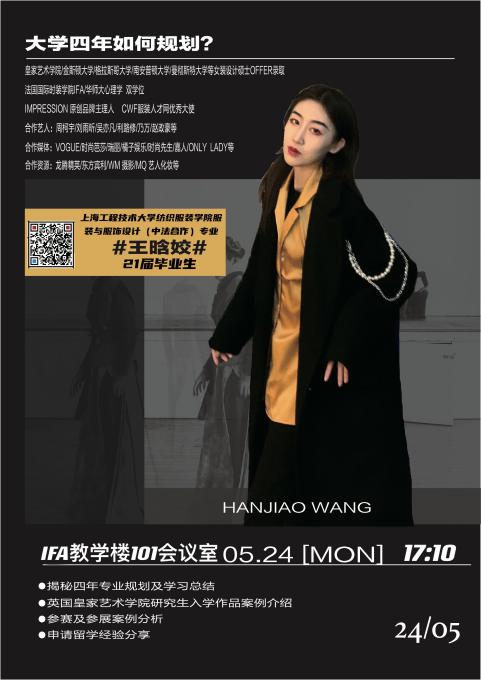 Wang Hanjiao is a graduate of 2021 from the School of Textiles and Fashion, majoring in Fashion and Accessory Design (Sino-French Cooperation). She was admitted to the Royal College of Art and received offers from other universities with her outstanding academic achievements. As well as a bachelor's degree in Art from Shanghai University of Engineering and Science and IFA, Wang also has a degree in psychology from Huadong Normal University. She is also the Owner-Principal of an original brand - IMPRESSION and the Excellent Ambassador of CWF Fashion Talent Network. Wang shared her four-year study planning, introduced some example cases of the postgraduate entry works for the Royal College of Art and some competition and exhibition cases. The lecture gave a detailed explanation of laying a design found in the first year, studying key courses in the second year, attending competitions and exhibitions in the third year, and preparing for further study at home and abroad in the fourth year. Wang also mentioned the significance of participating in competitions during college years, which will help students for their future study and career, so students were encouraged to actively join various competitions to accumulate experience during the study period.