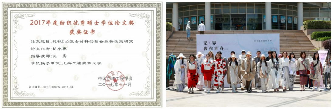 Graduate students have participated in important national, provincial, industry, university, and research projects, as well as various scientific and technological innovation projects, subject competitions, academic conferences, etc. In recent years, they have won nearly 50 provincial and ministerial level or above awards, including the second and third prizes in the National Graduate Mathematical Modeling Competition, the second prize in the Shanghai Challenge Cup University Student Extracurricular Academic and Technological Works Competition, and the bronze medal in the National "College Student Challenge Cup". Multiple graduate students have won national scholarships, National Textile Excellent Master's Thesis Award, and Shanghai Excellent Master's Thesis. Some students are pursuing doctoral studies at renowned universities such as Hong Kong Polytechnic University, University of Macau, and Tung Wah University. In the past three years, graduate students have published over 460 academic papers, including 100 papers indexed in SCI/EI journals and 71 national patents.