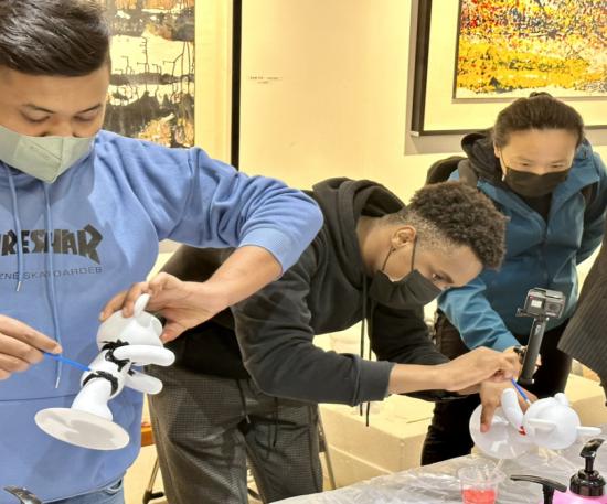 After walking out of the Shanghai Textile Museum, we walked into the M50 Creative Park located at 50 Moganshan Road to feel the charm of the integration of the old textile factory and modern art.First, we visited the latest exhibitions "UPUPUP" and "Preparing for Tomorrow" in the eight galleries, which inspired the students to create.Next, the students and teachers experienced the creation of brushless painting, and after learning the color matching skills and production methods, they created a unique fluid painting art.