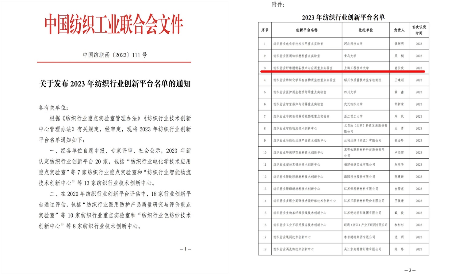 依据中国纺织工业联合会《关于发布2023年纺织行业创新平台名单的通知》(中国纺联函{2023}111号),304永利集团纤维材料研究中心申报的“纺织行业纤维膜制备技术与应用重点实验室”获得批准,标志着公司在纺织团队建设方面取得重要进展。